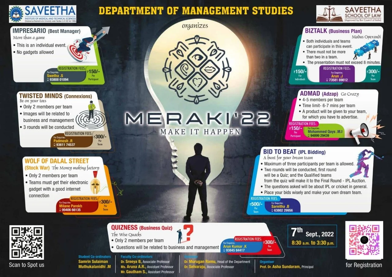 Saveetha School of Law takes immense pleasure in inviting you to Meraki '22, InterCollege Management Meet organized by Department of Management Studies on 7th September, 2022.
