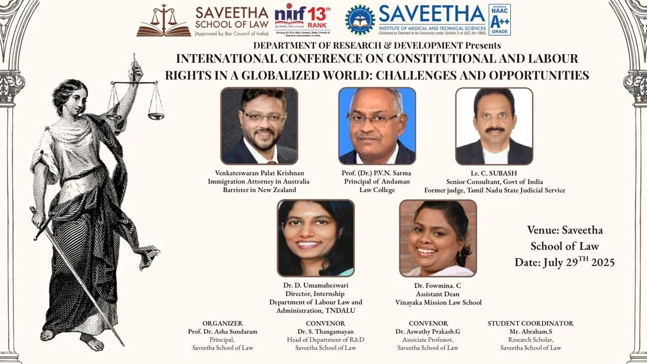 INTERNATIONAL CONFERENCE ON CONSTITUTIONAL AND LABOUR RIGHTS IN Tuesday, July 29, 2025 8:00 AM 4:00 PM 08:00 16:00 Saveetha School of Law 162 Ph Road Chennai, Tamil Nadu, 600077 India (map) Google Calendar ICS Click me for brochure