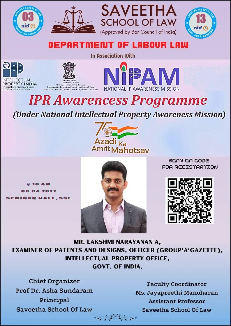Department of Labour Law is organising an IPR Awareness programme - Nipam on 08/04/2022