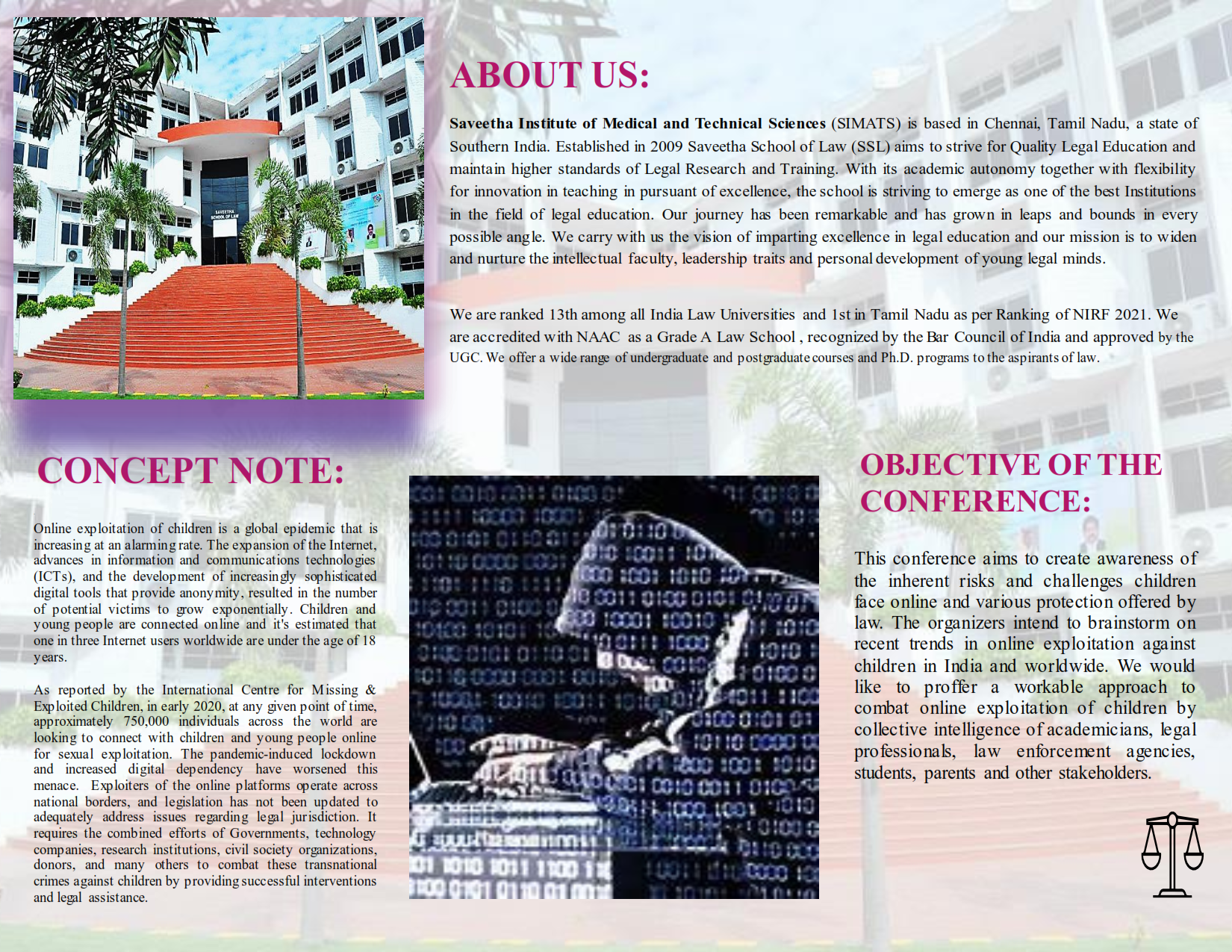 We take immense pleasure in inviting you all for the “ One Day National Conference on Protection Of Children In Cyberspace” on 6th of September 2022. Organised by Department of Criminal Law, Saveetha School of Law (SIMATS) In Association with The Centre For Criminal Justice Research (CCJR) & Tulir ,Centre For The Prevention & Healing Of Child Sexual Abuse. This conference aims to create awareness of the inherent risks and challenges faced by children online and to analyse the legislation in combating it. The organizers intend to brainstorm on recent trends in online exploitation against children in India and worldwide.