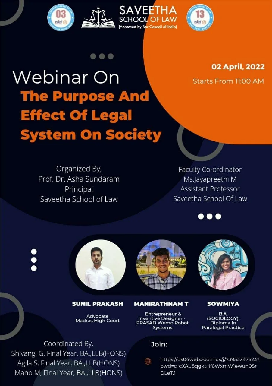 Dear All, Greetings from Saveetha School of Law We take immense pleasure in inviting you all to a webinar on The Purpose And Effect Of Legal System On Society The webinar sessions will brief about The Purpose And Effect Of Legal System On Society and on various topics in relation to it.