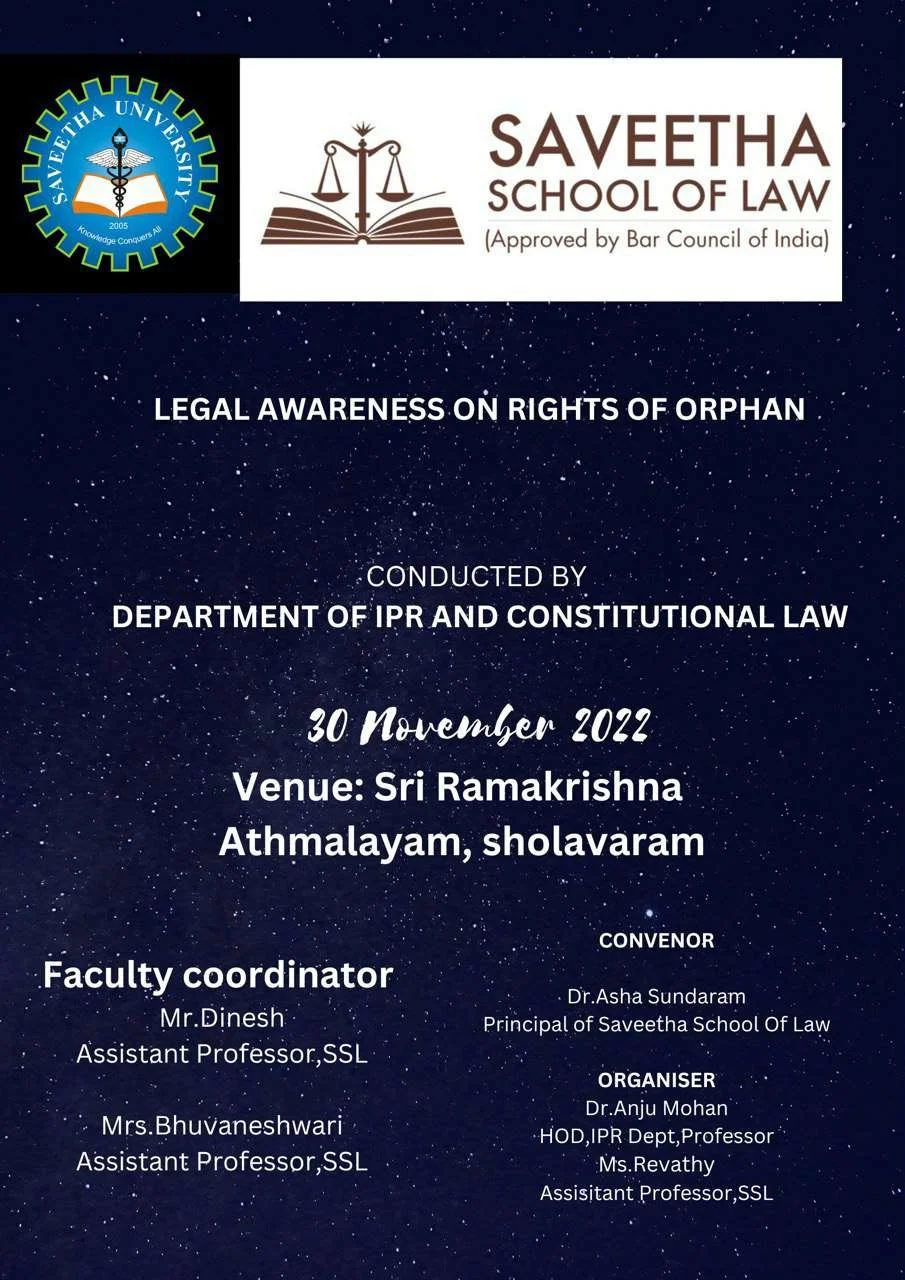 On 30th November 2022, Department of IPR, Constitutional law and Management along with 40 students from SSL conducted legal awareness program at Sri Ramakrishna Athmalayam , Sholavaram. Our students had interacted with them and explained the Rights of orphans.We have contributed some groceries like rice , urad dhal, soap, detergent, etc and other necessities which was great helpful to them. We received "Bharathathai Seva Award" also from the trust
