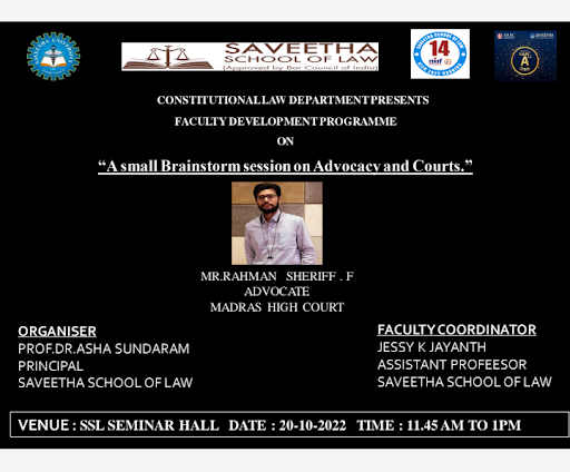 Department of Business law, organised a Faculty Development Program. Mr.Rahman sheriff.f, Advocate, Madras Highcourt delivered A Small Session on Advocacy and Courts on 20th October, 2022.