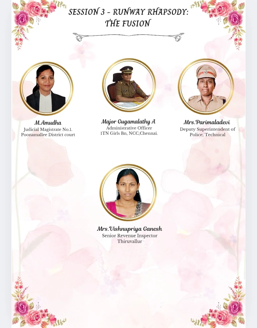 Runway Rhapsody concluded the festival with a fashion showcase inspired by “The Five Elements” - earth, water, fire, air, and space. Teams creatively combined traditional aesthetics with modern feminist narratives, using costumes and ramp choreography to symbolize harmony and strength. The judging panel included Major Gugamalathy A (Administrative Officer, 1TN Girls BN, NCC Chennai), Mrs. Parimaladevi (Deputy Superintendent of Police, Technical), Mrs. Vishnupriya Ganesh (Senior Revenue Inspector, Thiruvallur), and Ms. Amudha (Judicial Magistrate No.1, Poonamallee District Court). The fusion of fashion and storytelling transformed the ramp into a stage for empowerment and diversity.