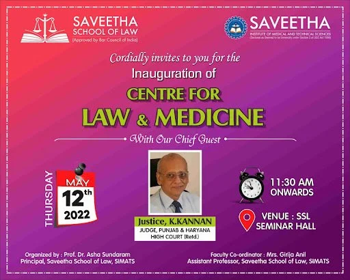 Saveetha School of Law, SIMATS Inaugurated Centre for Law & Medicine on 12/05/2022. Justice K Kannan, Retd Judge, Madras High Court was the chief Guest for the program.