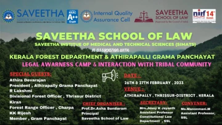 Department of Constitutional law in association with Kerala Forest department conducted a legal awareness program for the tribal peoples of Athirappilly forest range. It was a good experience for our students also since they had an awareness of the complexity of relationship of tribal communities with other social, political, cultural institutions that exist in our society. They also had an opportunity to visit places inside the forest, the Kerala Forest Department officials helped us to move around and inside the forest..