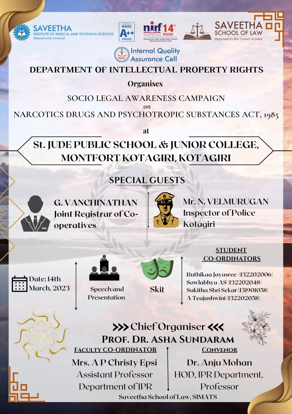 IPR department conducted a socio legal Awareness programme on The Narcotics Drugs and Psychotropic Substance Act (1985) at the St. Jude's Public School & Junior College Kotagiri, Montfort Kotagiri. Here on 14 of March 2023. It was led by Vanchinathan , who is of Sub collector’s Ranking serving as Joint Registrar of co-operatives and Mr.N.Velmurugan Inspector of Police ,Kotagiri.