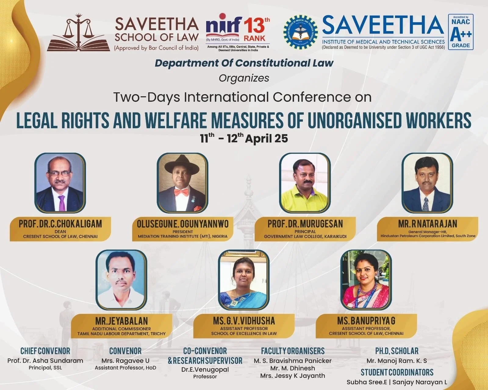 The Department of Constitutional Law, Saveetha School of Law, organized a Two-Day International Conference on "Legal Rights and Welfare Measures of Unorganised Workers" on April 11–12, 2025. Esteemed guests include Prof. Dr. C. Chokalingam Dean Cresent School of Law, Olusegun E. Ogunyannwo president Mediation Training Institute Nigeria , Prof. Dr. Murugesan, Principal Government Law college , Mr. R. Natarajan General Manager - HR, Hindustan Petroleum south Zone, Mr. Jeyabalan Additional Commissioner, Labour department Trichy, Ms. G. V. Vidhusha Assistant Professor and Ms. Banupriya G, Crescent SChool of Law. The conference aims to deliberate on the socio-legal challenges faced by unorganised workers and explore effective welfare strategies. The conference witnessed the discussions, research presentations, and collaborative dialogue to drive policy reforms and enhance the welfare of unorganised workers. Faculty Organizers are M. S. Bravishma Panicker, Mr. M. Dhinesh, and Mrs. Jessy K. Jayanth and Research Scholar Manoj Ram K S.