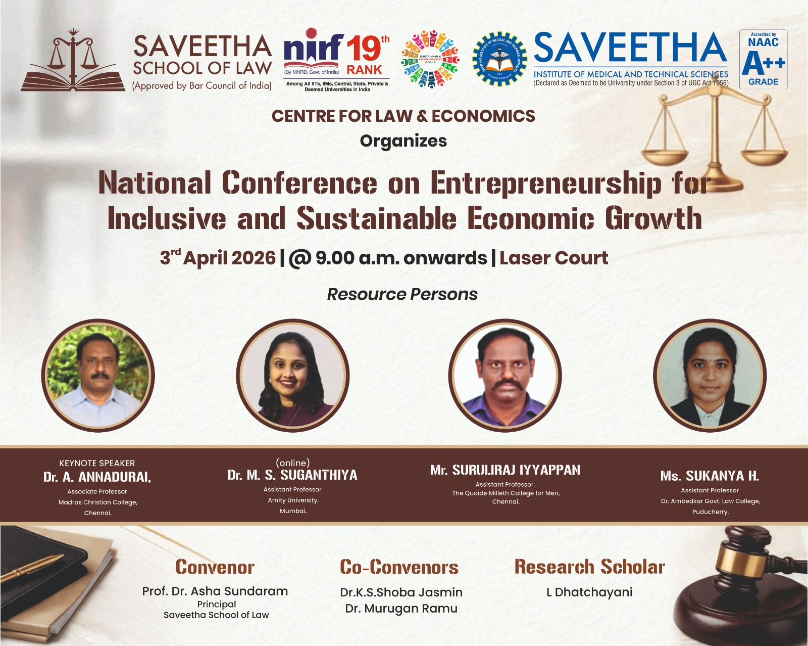 The National Conference on “Entrepreneurship for Inclusive and Sustainable Economic Growth” organized by the Centre for Law and Economics, Saveetha School of Law, SIMATS, on 3rd April, 2026 brought together academicians and scholars to deliberate on contemporary entrepreneurial challenges and opportunities. The conference featured distinguished resource persons including Dr. A. Annadurai, Madras Christian College, Chennai as the keynote speaker, Dr. M. S. Suganthiya, Amity University, Mumbai, Mr. Suruliraj Jyyappan, The Quaide Milleth College for Men, Chennai, and Ms. Sukanya H., Dr. Ambedkar Govt. Law College, Puducherry.