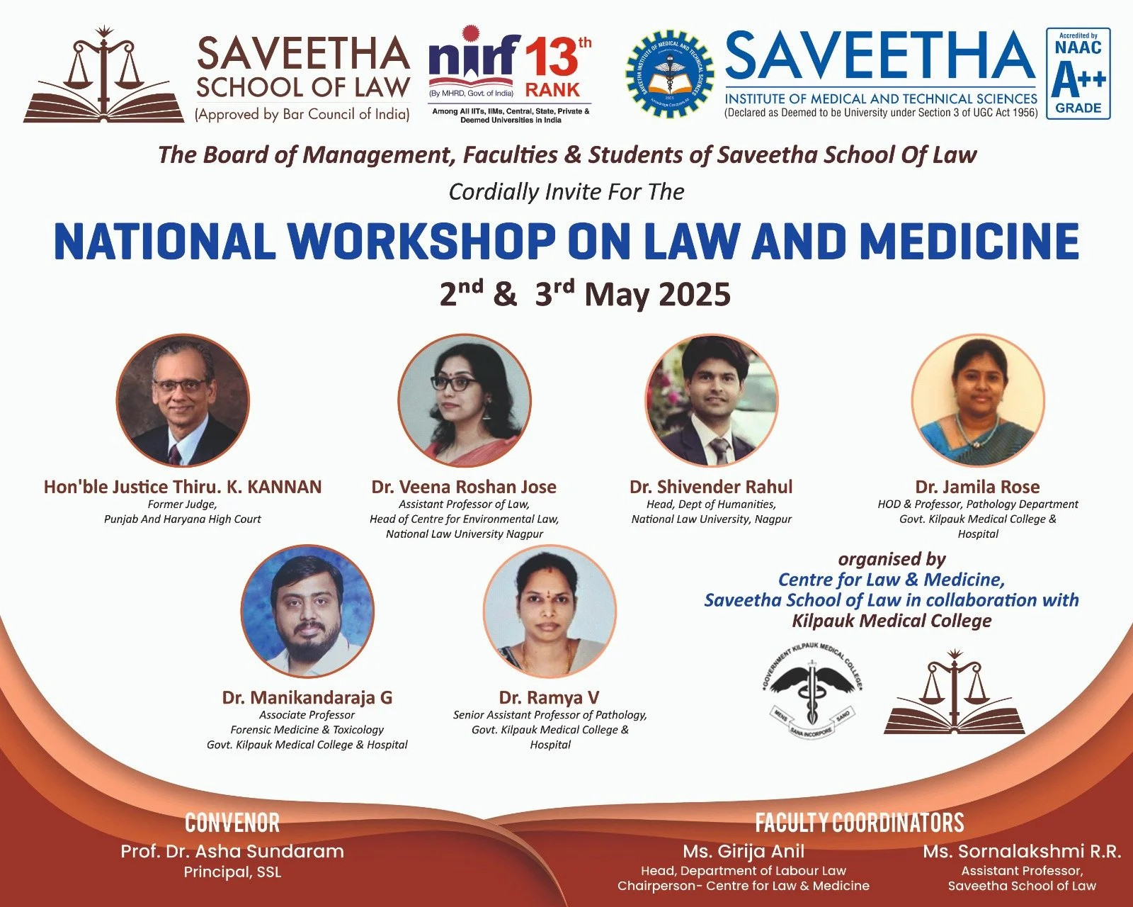 National Workshop on Law and Medicine Organized by the Centre for Law and Medicine, Saveetha School of Law, in collaboration with Kilpauk Medical College. held on 2nd & 3rd May 2025