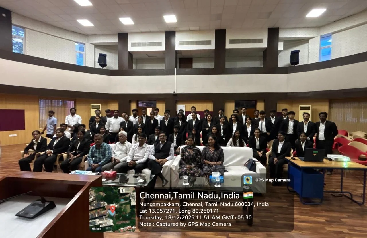 Sixty students from Saveetha School of Law visited the Income Tax Office, Chennai, 18/12/2025, to attend a three-hour workshop on the theme “Direct Tax Compliance and Administration.” The workshop was organised by Ms. S. Jayasaranya and Ms. G. Keerthana, Assistant Professors, Department of Business Law, Saveetha School of Law, in collaboration with the Income Tax Department, Chennai.
