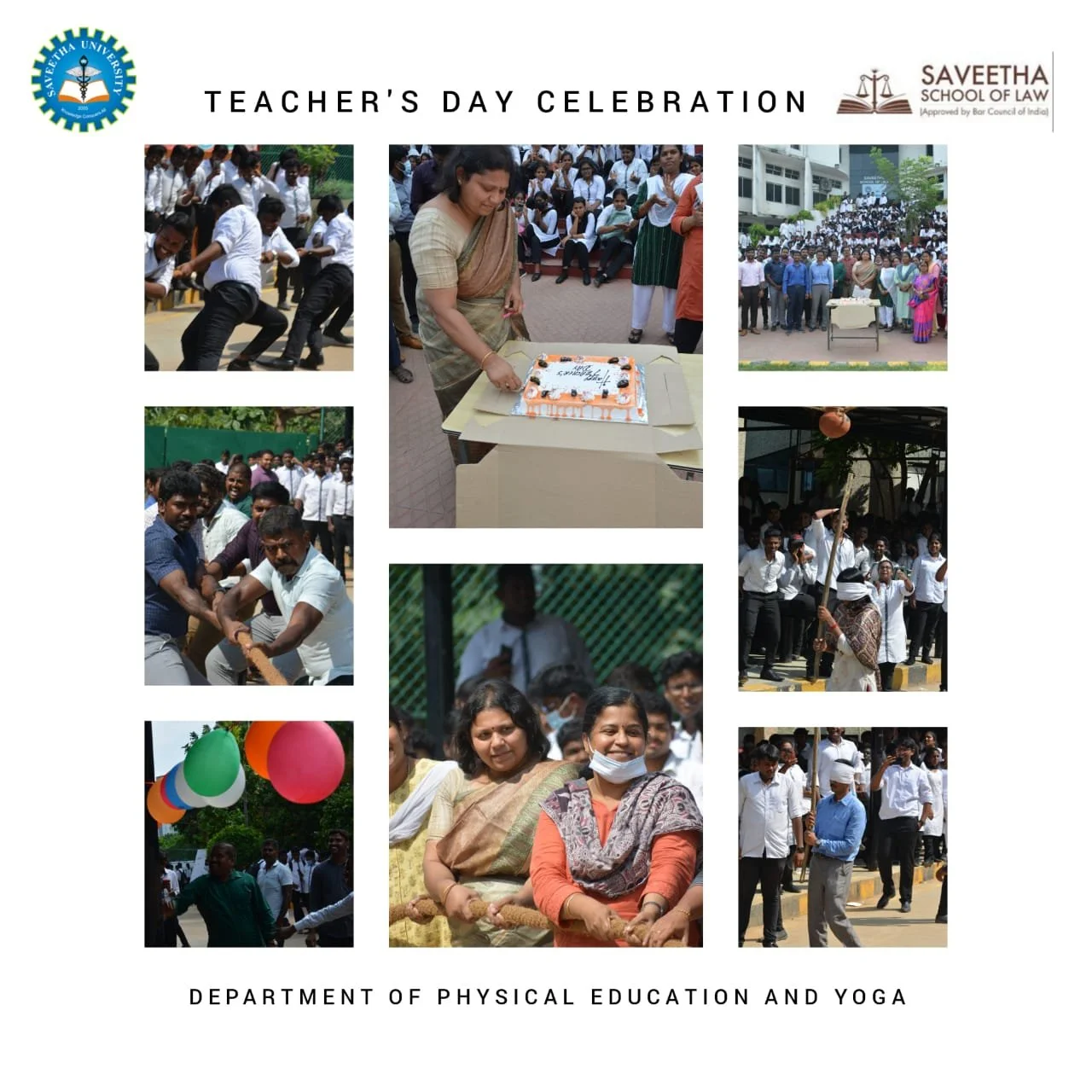 Saveetha School of Law, Department of Physical Education and Yoga Organized Teacher's Day Celebration on the Birth Anniversary of Dr.S.Radhakrishnan on 5th September 2022, at Saveetha law college. The Slot E students Organized the event and conducting Tug of war-staff Team Vs Students, Breaking the Pot and Balloon Bursting. Finally Teachers Day Celebration Special Address Delivered by Dr.Asha Sundaram, Principal, Saveetha School of Law.
