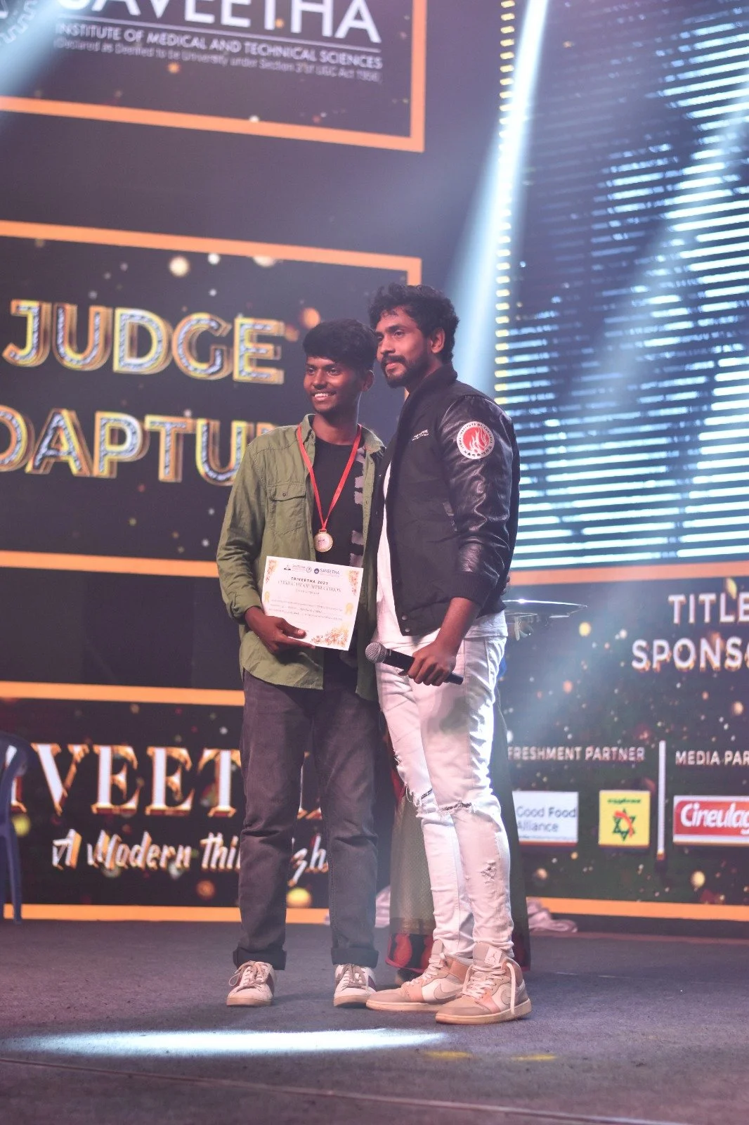 The first event of the day was Semi-Classical dance, which was performed by all four teams. The guest of the event, Ms. Manasa, announced the result of the event followed by a majestic classic dance performance by her. The next set of guests included Ms. Shivin Ganesan, an Indian model, Mr. Goutham, a director and alumni of Saveetha School of Law, and Ms. Sivagami, a singer. The short films of all the four teams with the common theme of LGBTQ+ were screened, and the judges, Ms. Shivin and Mr. Goutham announced the results. Both the judges called upon the short film crew of all the four teams and delivered their comments on stage.