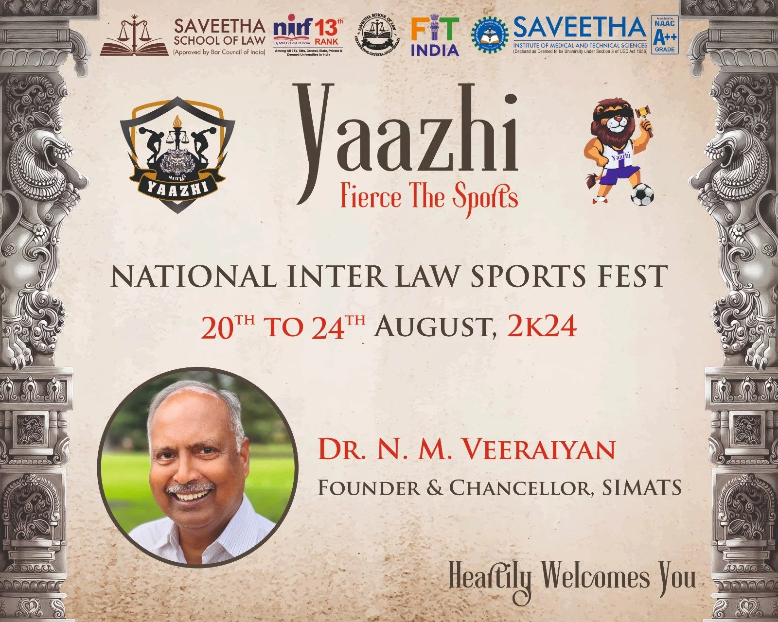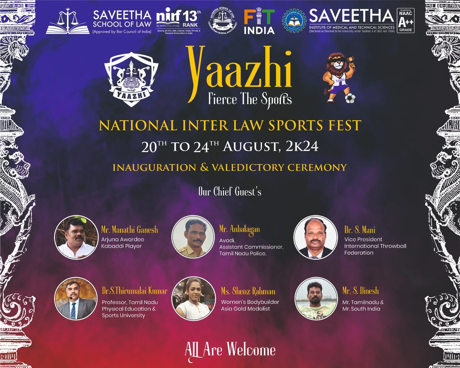 YAAZHI 2024 , National Inter Law Sports Fest conducted by Department of Physical Education and Yoga, Saveetha School of Law from 20th to 24th August, 2024 was a grand success.